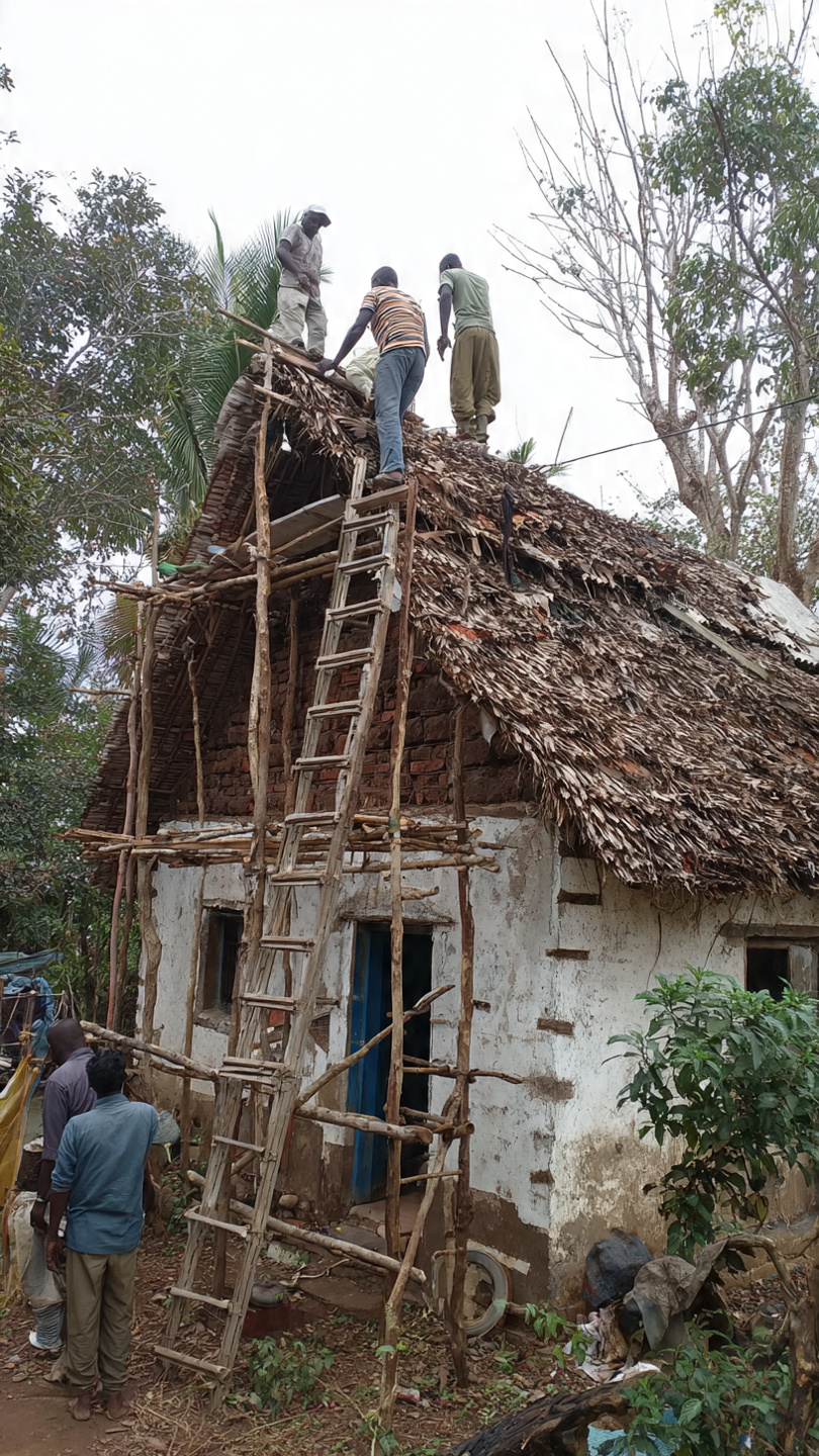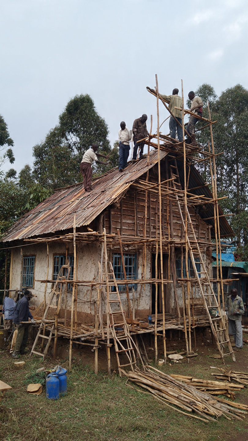 Volunteers repairing a small rural house with wooden scaffolding and new roofing sheets.